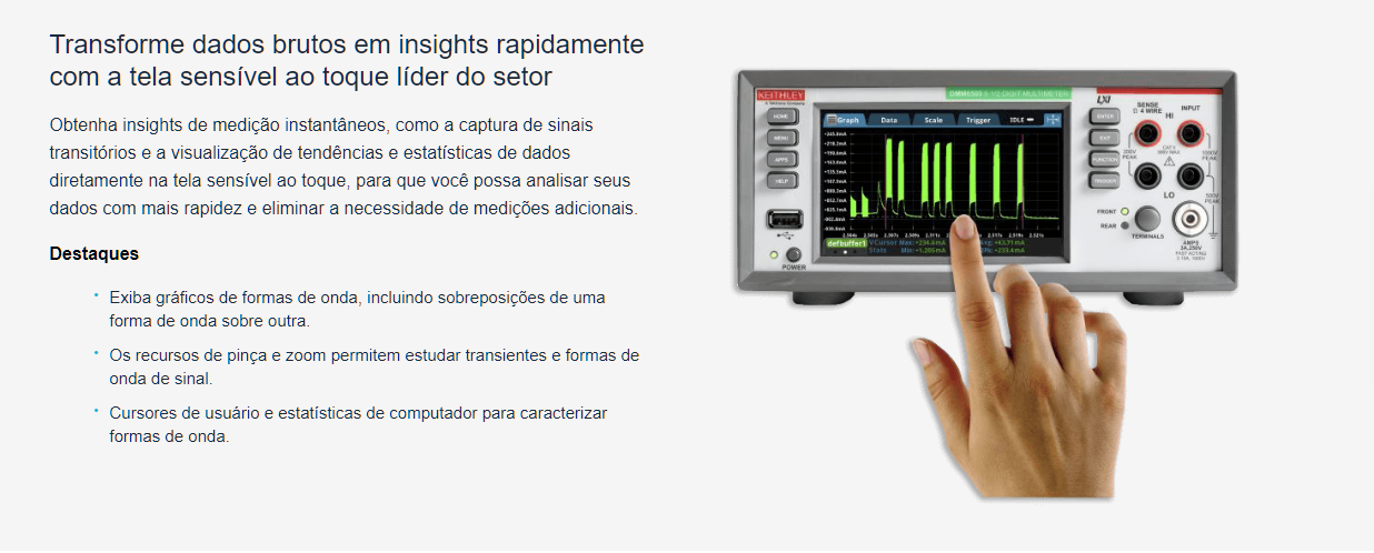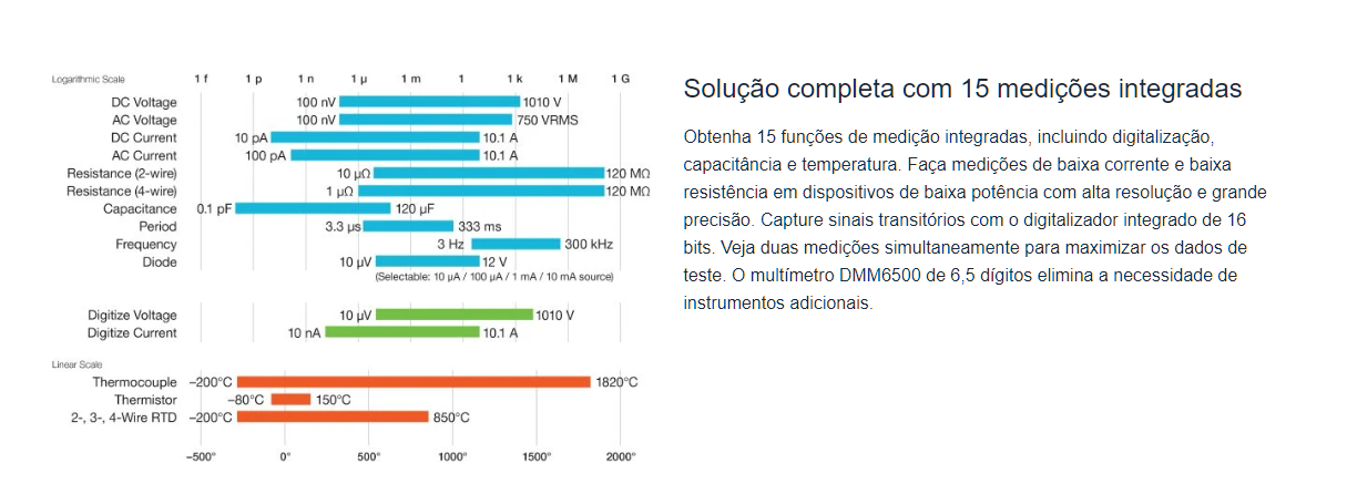 Trata-se de um multímetro digital de 6½ dígitos, ideal para testes avançados, calibração e validação de sistemas eletrônicos.