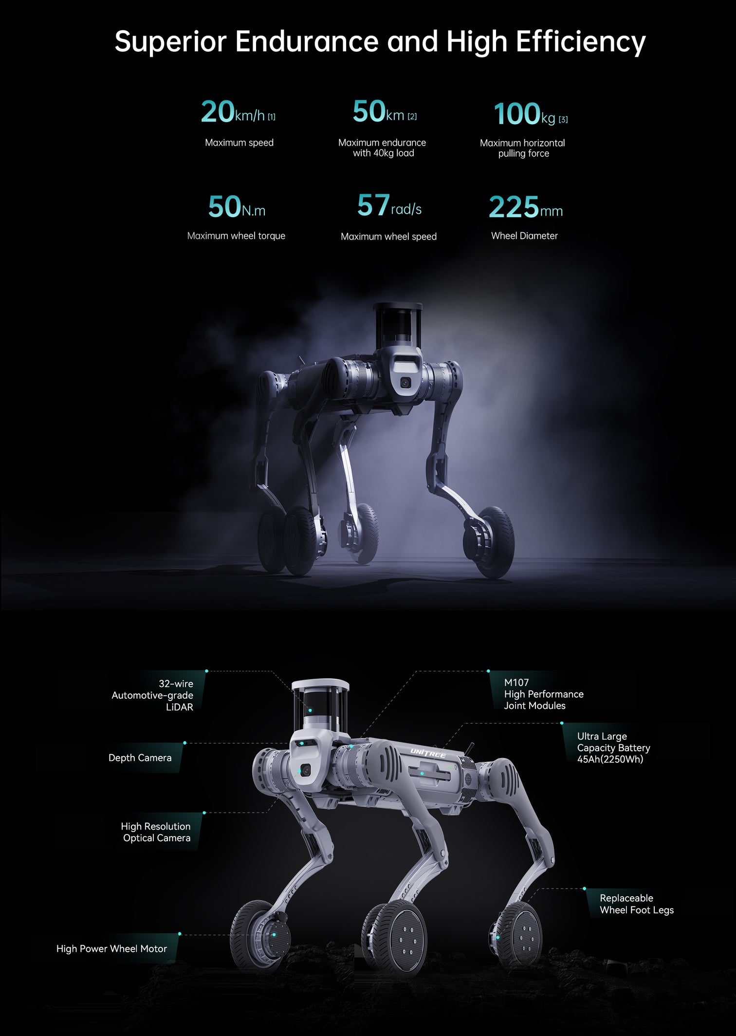 Principais recursos Robô quadrúpede Unitree B2-W com rodas e pernas, autonomia de até 50 km, velocidade de 20 km/h, suporta 40 kg de carga, sensores LiDAR, câmera de profundidade, resistência IP67. Ideal para inspeções industriais, segurança e ambientes extremos.