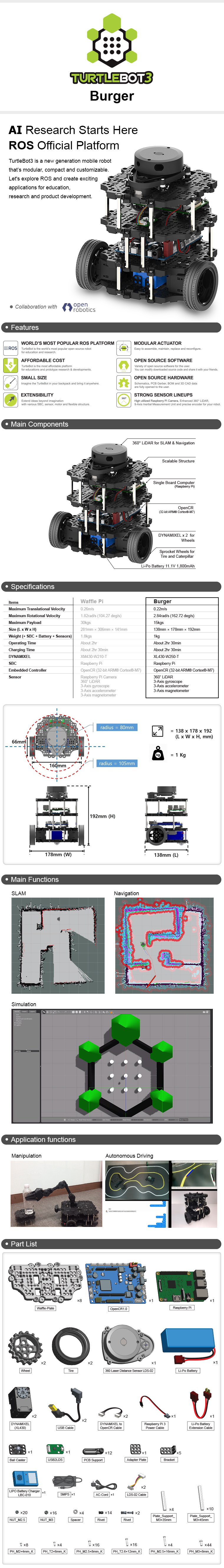 O design do TurtleBot3 Burger é leve, compacto e modular, facilitando montagem, manutenção e expansão com novos sensores e atuadores. Sua estrutura robusta, aliada à padronização dos componentes, garante confiabilidade durante testes e experimentos contínuos, além de excelente portabilidade para uso em diferentes ambientes de pesquisa.