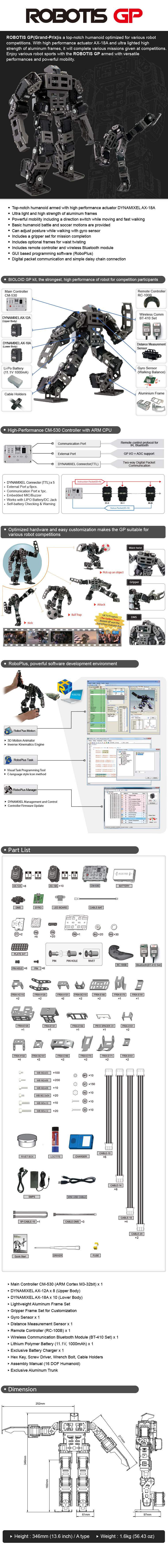 O Robô ROBOTIS GP com Kit Bioloid GP é um robô humanoide avançado desenvolvido pela ROBOTIS, projetado para aplicações em pesquisa, educação e desenvolvimento em robótica.