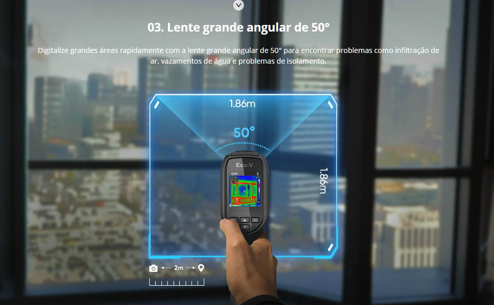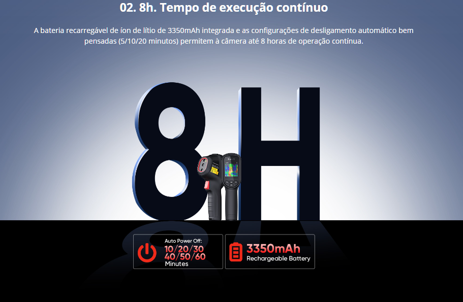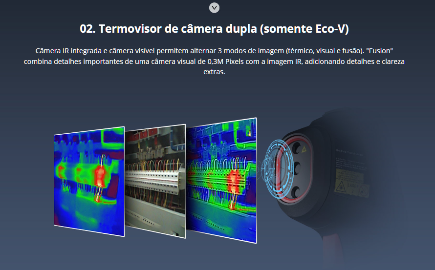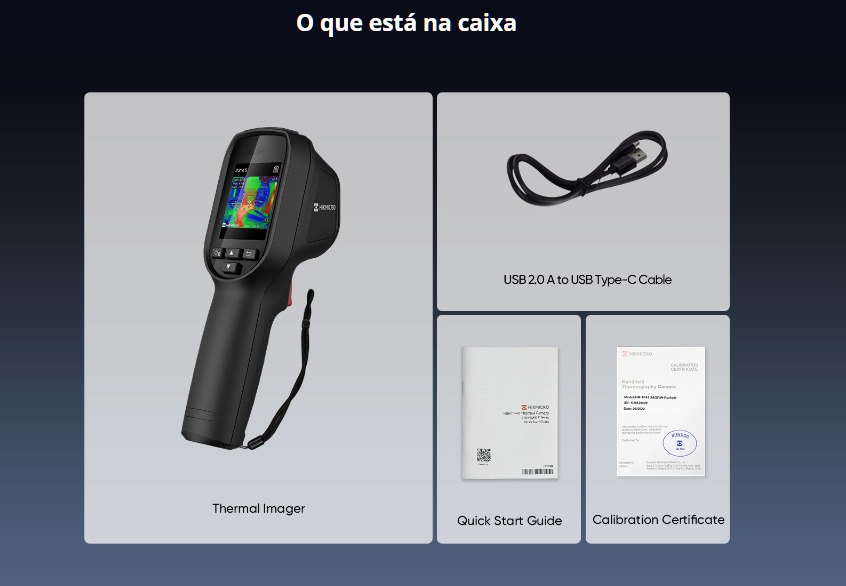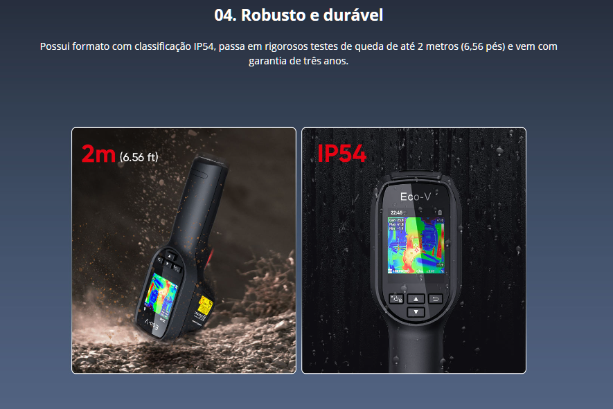 Com construção compacta e robusta, o termovisor é projetado para uso em ambientes industriais e técnicos, oferecendo resistência adequada para operações em campo. Seu design leve e ergonômico garante conforto durante o uso prolongado, sendo uma solução portátil e prática para profissionais de manutenção.