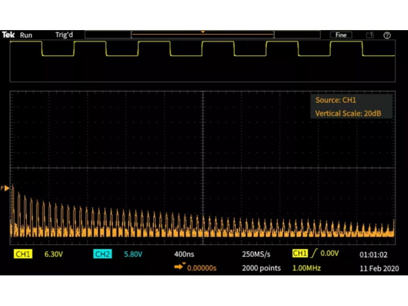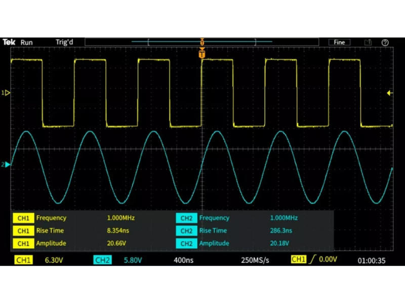 O osciloscópio TBS1102C oferece recursos avançados de matemática e metrologia que facilitam a avaliação da qualidade do sinal Você pode adicionar, subtrair e multiplicar formas de onda ou usar qualquer uma das 32 mensurações automáticas para calcular de forma rápida e confiável características importantes do sinal como frequencia, tempos de subida ou overshoot. O osciloscópio TBS1102C possui uma função FFT de janela dupla com visualização simultânea no domínio do tempo e da frequência.